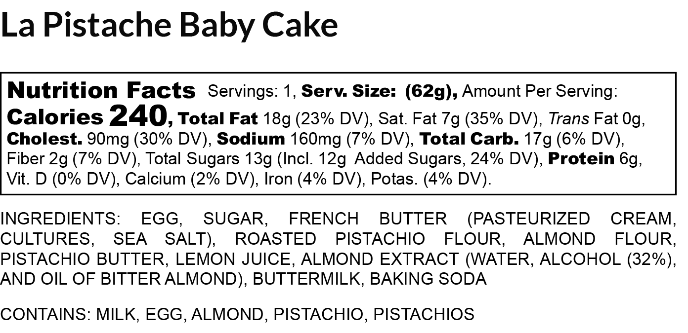 Savor the rich, nutty bliss of our Pistachio Baby Cake, a mini indulgence of moist pistachio-infused perfection. Unforgettable taste in every bite! Made with gluten free ingredients.